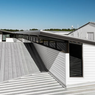 Standing seam metal roofs clad a combination of low-slung agrarian “saddle” roofs, shed roofs and hips, reinforcing the additive nature of much of the architecture found in the southern region of the United States and the northern part of Florida in particular.