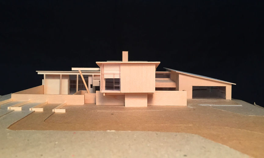 A lookout “bridge” springs from an interior stair system breaking the orthogonal organization of the remainder of the house. This stair is a “both and” element also functioning as platforms to display sculpture. The stair provides a rotational “interference” and asserts its presence in interior and exterior plan elements. The bridge functions as a “lookout”, a contemplation place where the elevation is high enough above grade to take advantage of a lake front view.
